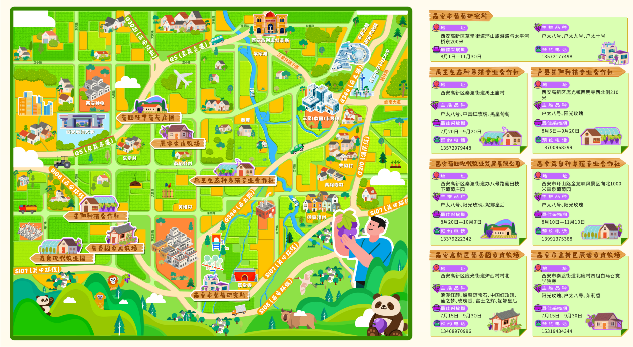 据悉,全区现有葡萄种植户800余家,种植面积2.2万亩,预计年产出4.5万吨。同时,今年新增百亩智慧园区实现精准种植,142亩果业提质增效项目落地,并引进丛林玫瑰、巨盛一号、妮娜皇后、含香美人娇等12种葡萄新品种。这里给大家附上西安高新区的“葡萄地图”,欢迎大家来品尝!