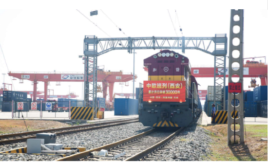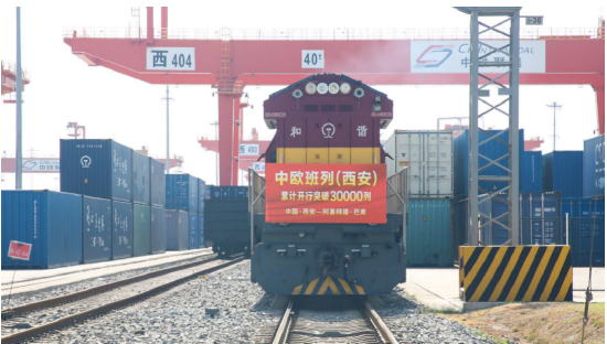 8月13日9时50分,满载着55个集装箱光伏组件的中欧班列(西安)从西安国际港站缓缓驶出,一路向西经霍尔果斯口岸出境,穿越哈萨克斯坦全境、跨里海,开往阿塞拜疆巴库,标志着中欧班列(西安)自2013年开行首列以来累计开行突破3万列,开行总量超过全国中欧班列累计开行总量的四分之一。西安也成为全国首个中欧班列累计开行量突破30000列的城市,不沿边、不靠海的内陆西安,成为全国向西开放“桥头堡”。