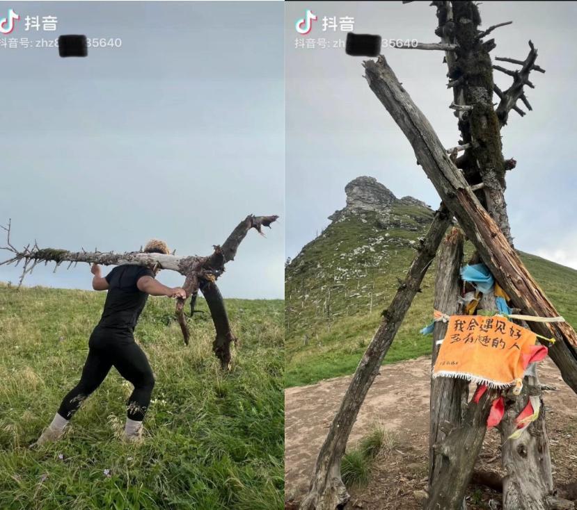 日前,经监测发现,抖音用户“史迪仔仔”发布视频,展示其非法穿越至鹿角梁区域,搬运枯立木对“鹿角梁导航架”进行恢复,并配以误导性文字,公然挑战法律红线,对多方努力形成的核心保护区管控格局造成不良影响。