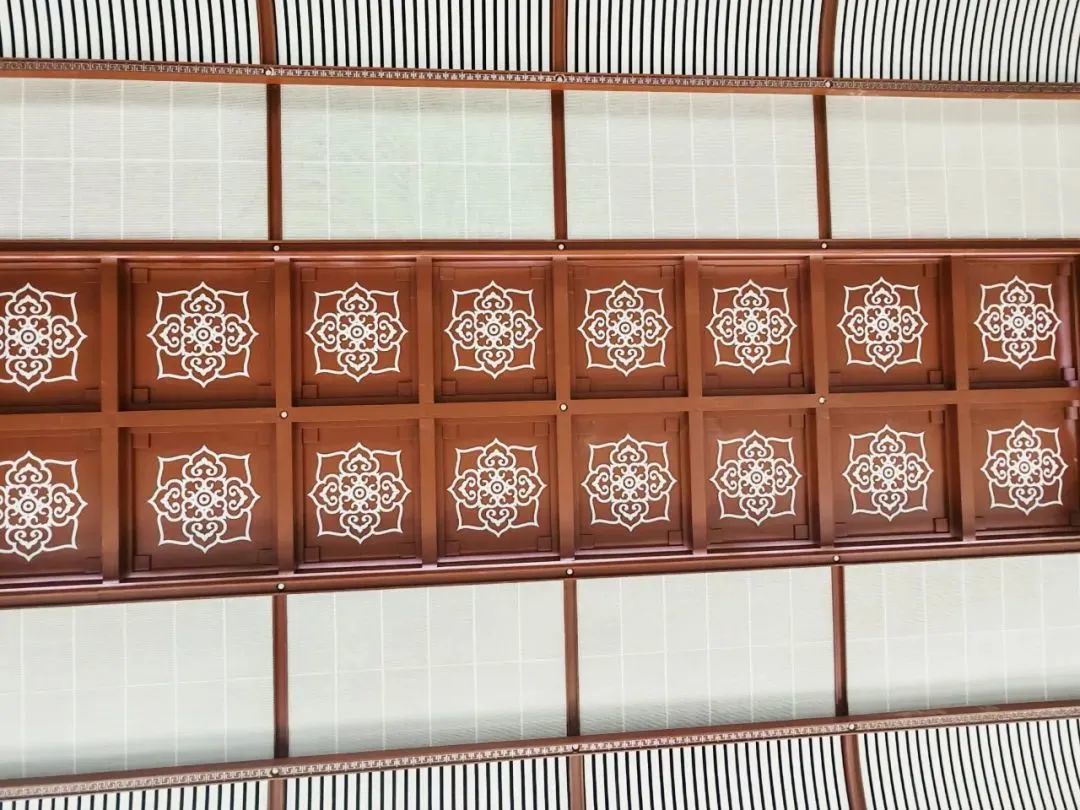 候车大厅天花板及出风口图案源自柿子叶柄形态,经叠加重组形成层次丰富的装饰纹样,既规整又灵动。