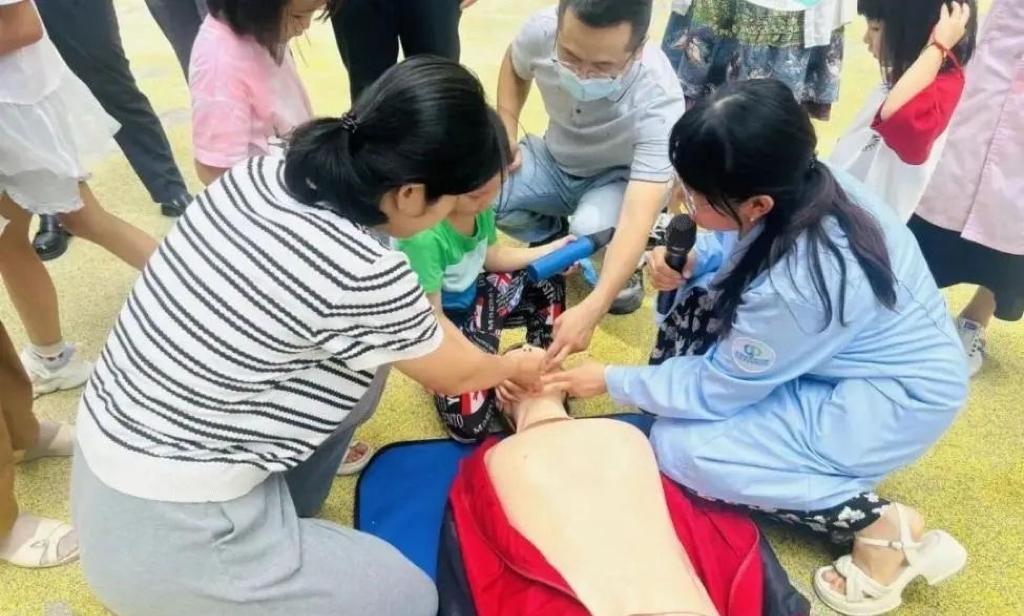 另一侧,红十字会急救员现场进行心肺复苏教学与实操指导,普及急救技能,提升居民应急自救互救能力,为社区安全增添保障。