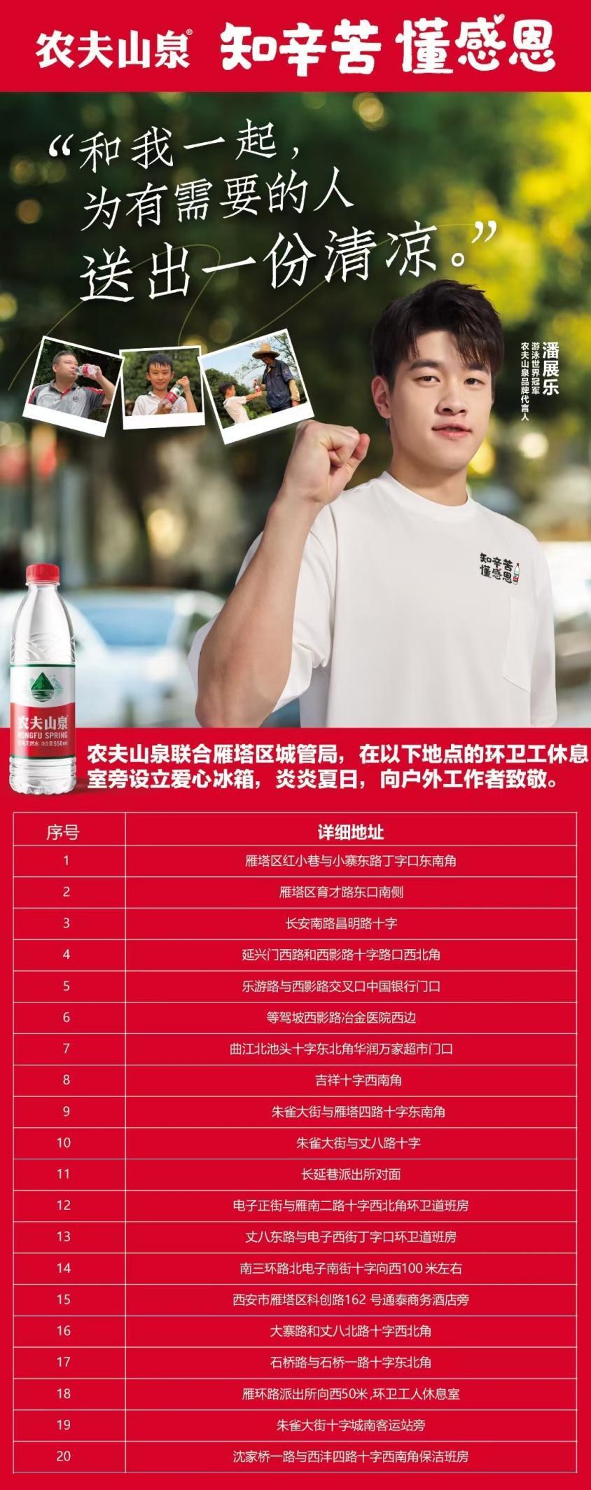 在“益企向善——一刻钟便民公益服务‘夏日送清凉’” 系列活动框架下,农夫山泉联合雁塔区城管局投放的20个爱心冰箱,已在西安市雁塔区的街头巷尾悄然度过首个服务周。这些静静伫立的 “清凉驿站”,不仅是高温季里户外劳动者的应急补水点,更把农夫山泉 “贴近劳动者、传递实在关怀” 的公益初心,化作了街头可见的温暖。