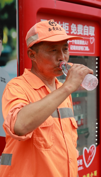 “不想让高温下的劳动者‘渴着跑’,这是我们做爱心冰箱的最初想法。” 农夫山泉陕西大区项目负责人的一句话,道出了此次爱心行动的初心起点。入夏以来,西安持续被高温笼罩,环卫工、外卖骑手、交警等户外劳动者的 “补水难题”,很快走进了农夫山泉的公益视野。正是怀着 “公益要接地气、要真解决问题” 的初心,企业迅速敲定爱心冰箱实施方案 —— 不搞形式化布置,专选户外劳动者高频经过的商圈路口、环卫站点、执勤岗旁设点;不做短期突击服务,郑重承诺持续一个月供应饮用水;不缺细节保障,每天安排专人定时补货到 “满箱”,确保早出晚归的劳动者随时能拿到冰爽的饮用水。