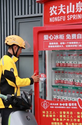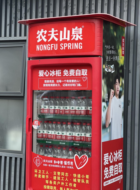中午 12 点,日头最烈的时候,外卖骑手小周刚送完写字楼的订单,骑着电动车直奔科技路的爱心冰箱。“有时候中午为了抢时间顾不上喝水,等高峰期过去就会先渴得发晕,这冰箱刚好在我们配送站附近,一瓶水下去就能缓解,还不用花钱,农夫山泉是真懂我们。”