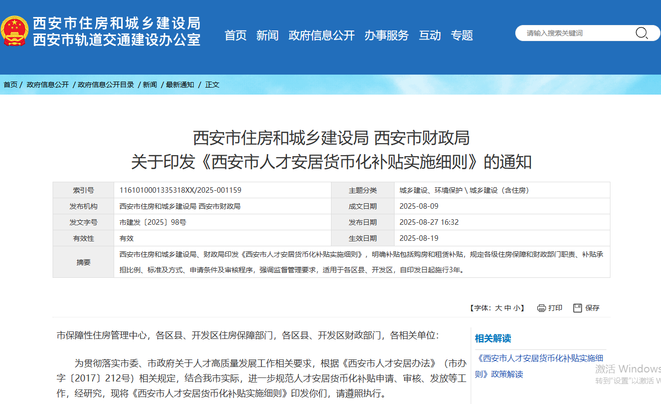 8月27日,西安市住房和城乡建设局官网发布西安市住房和城乡建设局 西安市财政局关于印发《西安市人才安居货币化补贴实施细则》的通知,详细内容如下。