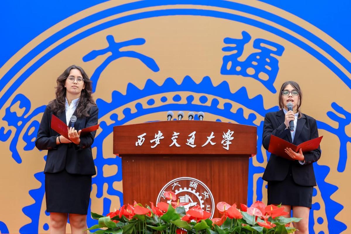 留学生新生代表,来自美国的双胞胎姐妹,医学部安嘉丽、安笑丽在开学典礼上分享了选择西安交大医学专业的原因和愿景。“我们被学校深厚的历史底蕴与创新活力所吸引,希望在这里接受优质医学教育,学习中文、融入中国文化,成为中外交流的桥梁。”她们鼓励所有新生勇敢面对挑战、珍惜大学时光、共同成长进步。