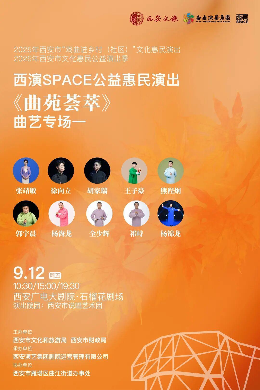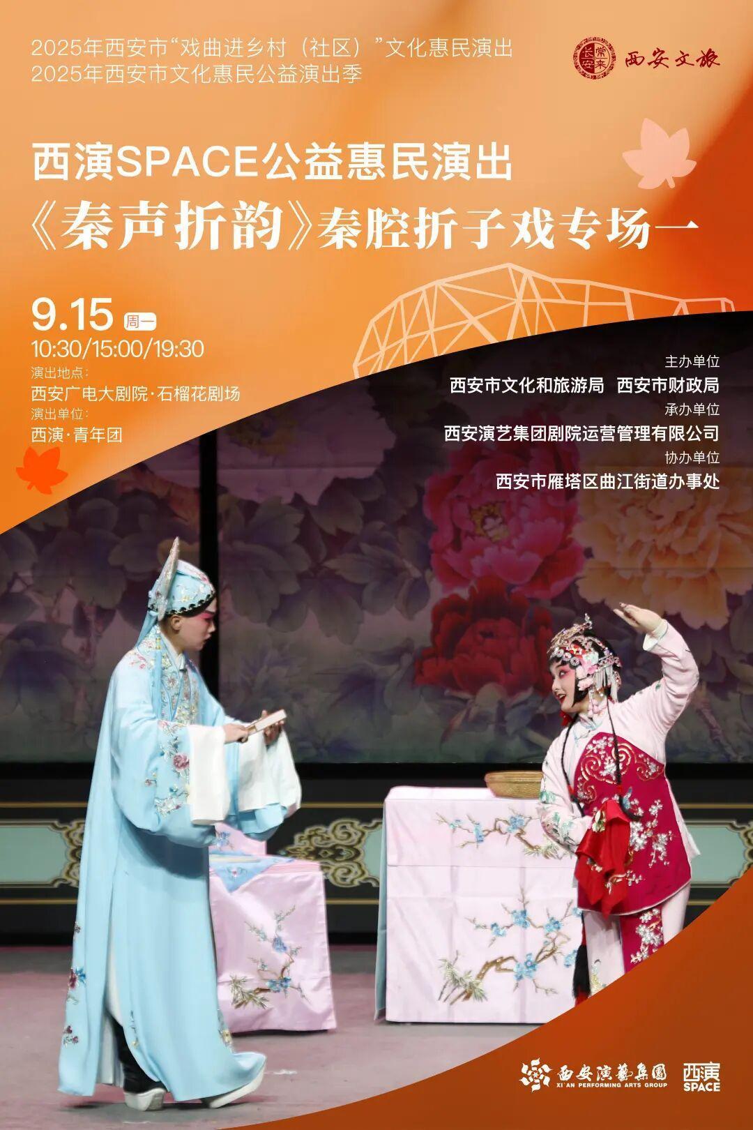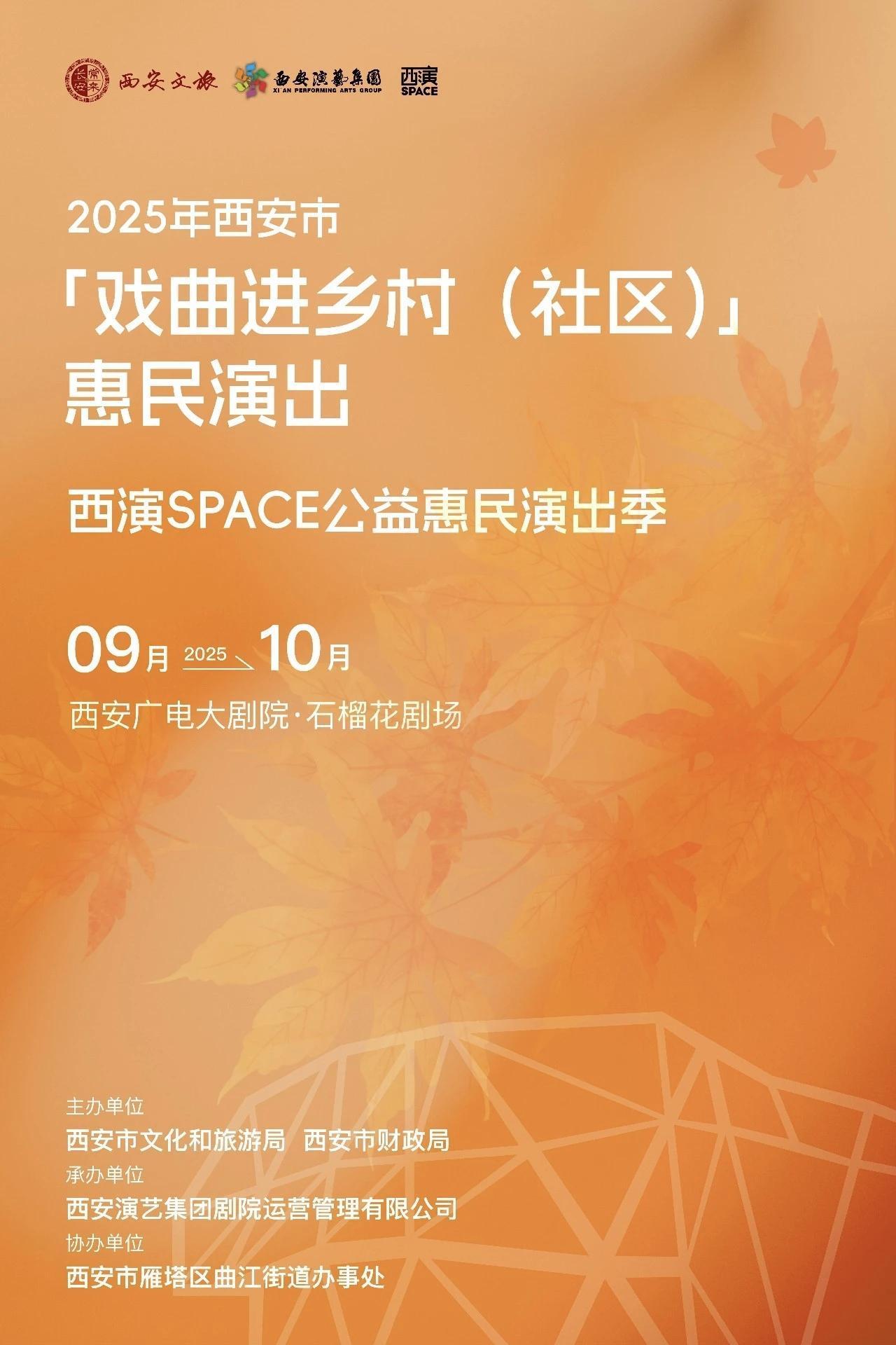 秋风送爽,丹桂飘香。无缝接档在8月落幕的“公益惠民纳凉演出季”,由西安市文化和旅游局、西安市财政局主办的2025年西安市“戏曲进乡村(社区)”惠民演出全新单元——“金秋惠民季”,将于9月12日启动。记者9月10日从活动承办方西演SPACE(西安演艺集团剧院运营管理有限公司)获悉,“金秋惠民季”将继续采用“0”元门票、免费预约的方式,邀请广大市民观众走入剧场,品味充满艺术乐趣的暖心文化大餐。