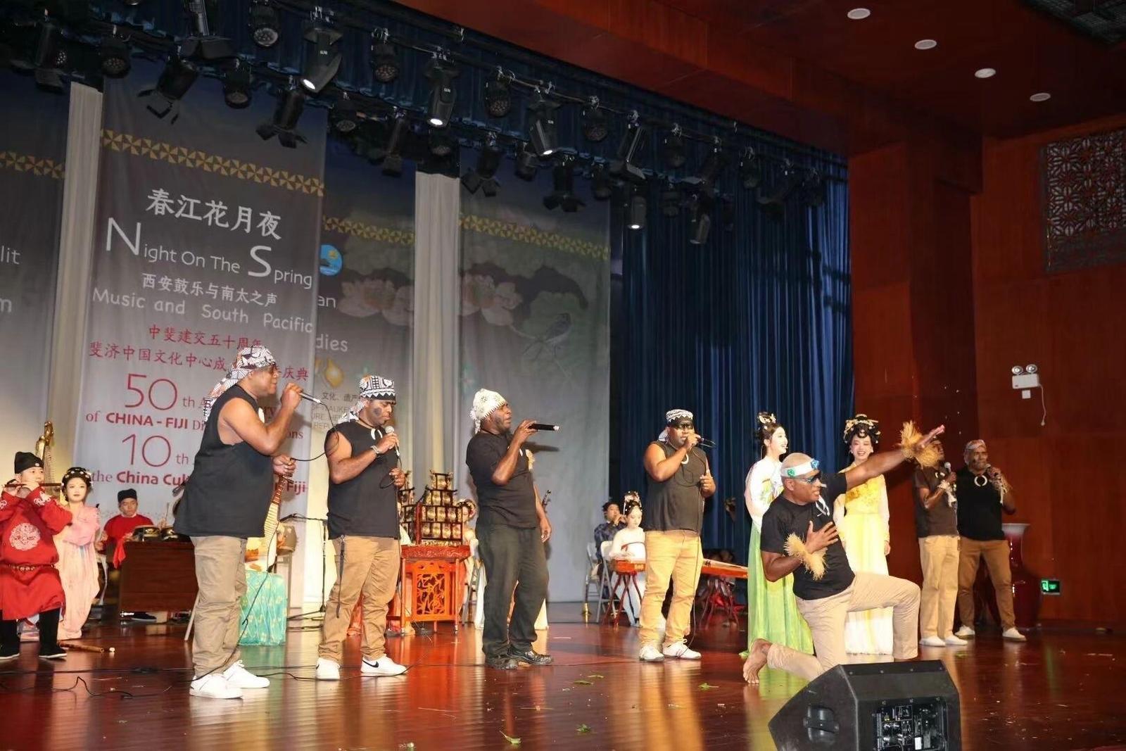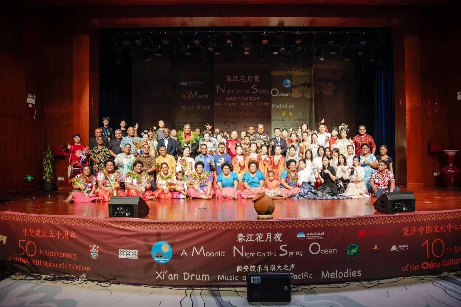 为庆祝中国和斐济建交50周年,作为中国陕西与斐济中国文化中心部省合作的年度收官之作,由文化和旅游部、斐济本土事务·文化·遗产和艺术部共同主办及陕西省文化和旅游厅、斐济中国文化中心、斐济国家艺术委员会承办的“西安鼓乐与南太之声”演出近日在斐济首都苏瓦成功举行,斐济多位政要以及商界、文化艺术界、教育界和侨界代表600余人现场观看演出。