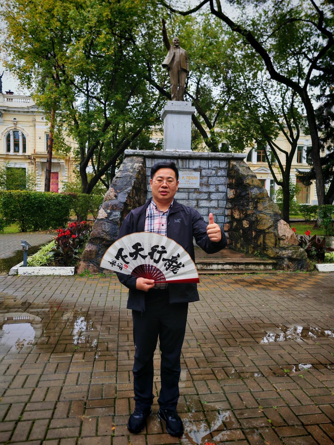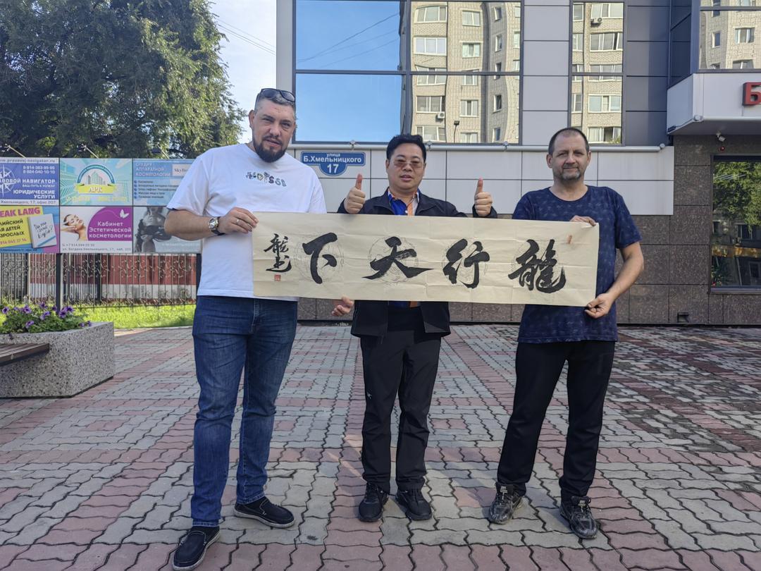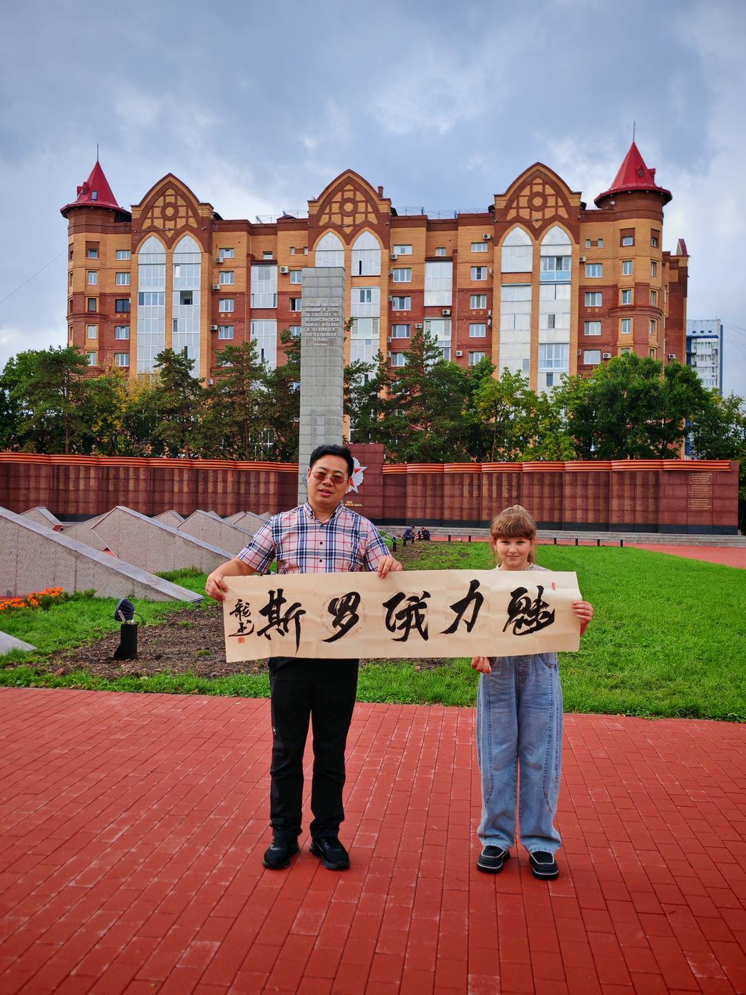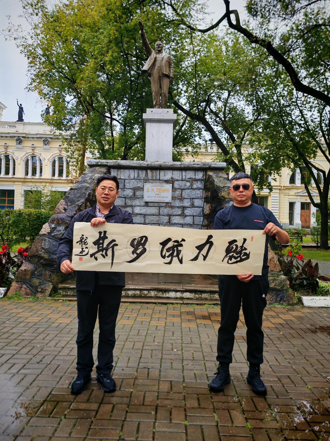 饮食与夜景是感受城市烟火的最佳方式。舌尖与眼底的体验,最是贴近一座城市的温度。我们品尝了俄罗斯特色美食:麦香浓郁的列巴、咸香醇厚的红肠、酸甜暖胃的红汤,地道风味里满是异国风情;晚间漫步于城市街头,欣赏着布拉戈维申斯克的江景夜色——江的对岸便是祖国黑河的璀璨灯火,两国城市隔江相望、交相辉映,这份独特的景致让人心生感慨。在胜利广场的凯旋门前,文化学者张龙即兴演唱改编版的《苹果香》,熟悉的旋律引得现场互动不断;张龙还以模仿伟人声音演绎经典话语,为此次行程增添趣味记忆点。作为文化学者与书法家,张龙更专程为此次中俄文化交流题赠“中俄友情万年长”“中俄一家亲”“情系俄罗斯”“龙行俄罗斯”“布拉戈维申斯克”等多幅书法作品,笔墨间饱含对两国友谊的美好期许,这些作品被一一赠予俄罗斯友人,以中国传统书法艺术传递深厚情谊。