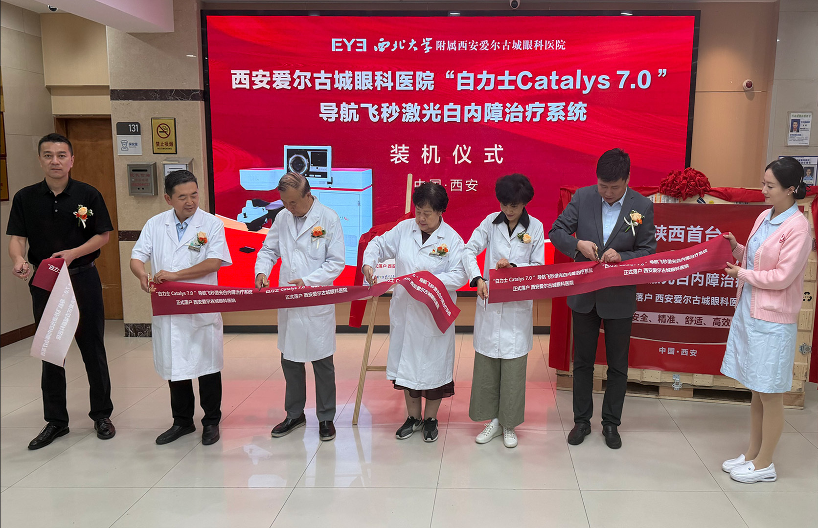 在当天的装机仪式上,爱尔眼科陕西省区副总院长、西安爱尔古城眼科医院院长张德秀、西安爱尔古城眼科医院名誉院长孟永安、西安爱尔古城眼科医院CEO王鑫,西安爱尔古城眼科医院业务副院长孟瓅,西安爱尔古城眼科医院白内障科主任李立刚以及厂家代表,十余家主流媒体共同出席,见证了陕西省首台"白力士Catalys 7.0"导航飞秒激光白内障治疗系统的启动。