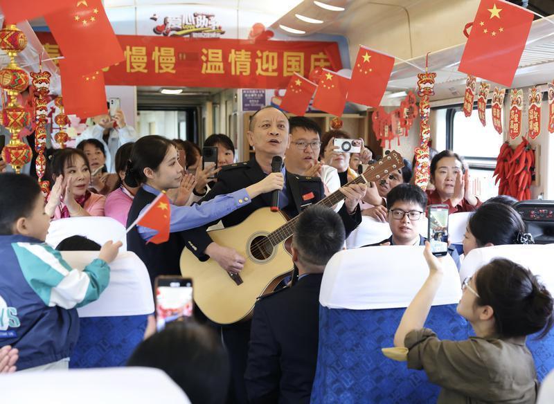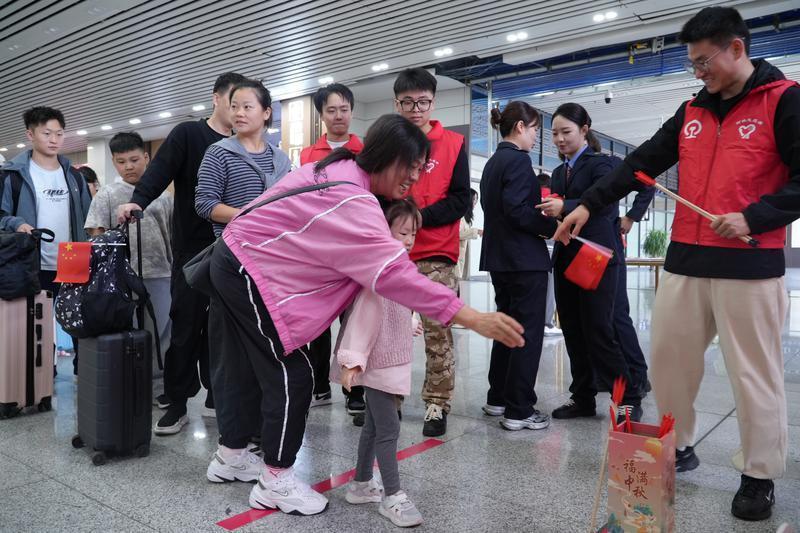 此外,为给旅客旅途增添节日氛围,西安客运段在6064次公益慢火车、G828次西安北开往香港西九龙的列车上举行歌曲、舞蹈、小品等系列文艺活动,与广大旅客共同庆祝祖国生日和传统佳节,传播中华优秀传统文化,工作人员还邀请旅客参与互动,手把手教大家正确的行李摆放方式、乘车安全注意事项,不少旅客表示:“原来乘车还有这么多小知识,这样的展示既实用又贴心。”宝鸡东站在宝鸡南站候车大厅精心举办“月满华诞 情暖旅途”主题文化活动,旅客既能在国庆主题打卡区拍摄纪念照,也能欣赏车站职工带来的国庆主题文化表演,为广大旅客营造了欢乐祥和的节日氛围。西安车务段、汉中车务段在管内各客运站精心组织开展“与国旗同框,为祖国祝福”主题活动,组织车站工作人员为候车旅客分发小国旗,让候车室变成了传递家国情怀的温暖空间。安康车务段万源车站以“月圆旅途·家国同庆”为主题,在候车大厅开展歌舞、魔术表演和猜灯谜等丰富的趣味活动,引得旅客纷纷鼓掌喝彩,为南来北往的旅客送上别样的旅途温暖。