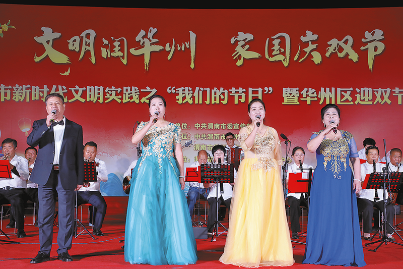 “咚咚锵,咚咚锵……”开场鼓声一响,男女老少纷纷围了过来。9月29日傍晚,一场以“文明润华州家国庆双节”为主题的文艺演出热闹上演,舞台搭在华州区子仪大街群众文化广场。渭南市新时代文明实践之“我们的节日”暨华州区迎双节文化活动背景板分外醒目。