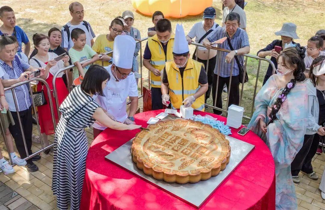 这个中秋节,武汉园博园举办“望月、奔月、赏月、品月”等中秋游园系列活动。邀请游客免费品尝大月饼,是公园举行的品月活动。