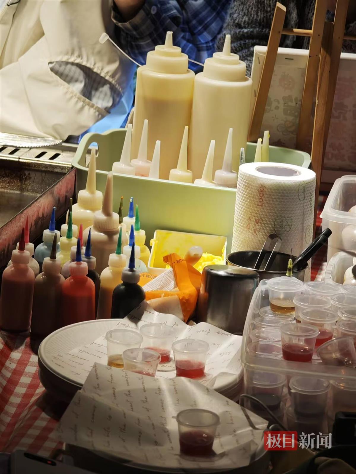 在煎饼摊后,摊主曾雅鑫正在聚精会神地画着煎饼,从一旁不断拿取不同的材料,一边看着手机上的图案,精心制作。在等待一个煎饼烤制的时候,她会开始画另外一个,以加快进度。即使如此,30号之后的顾客可能也得等到晚上十点半之后才能制作。