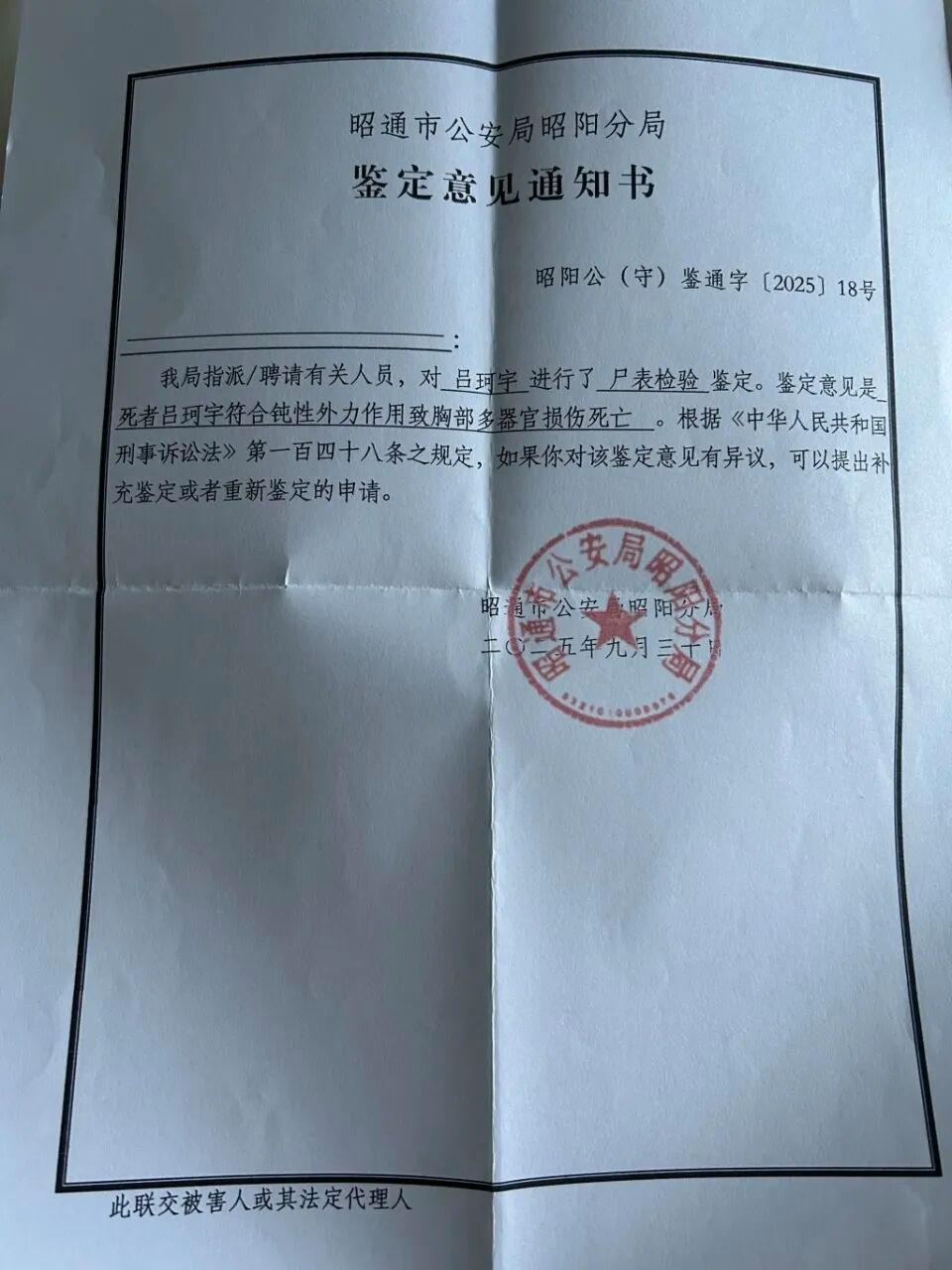 昭通市公安局昭阳分局出具的《鉴定意见通知书》披露了姑侄二人死亡的原因:吕珂宇遭遇钝性外力冲击,胸部多器官损伤死亡;吕国琼则同时受到钝性外力造成的颅脑损伤与胸部损伤,双重创伤导致其不幸离世。