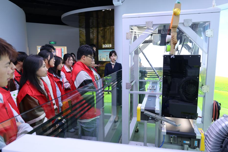 一套智能分拣系统同样吸引了众人的目光。“大家看,这套智能分拣系统能通过视觉识别和机械臂,快速将四类垃圾精准分离。”混合投放的垃圾被迅速识别并归入相应收集口,精准高效的操作引得师生连连赞叹。