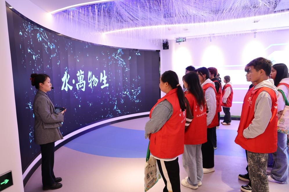 在讲解员的带领下,师生们依次深入探访咸阳市环境教育基地与光大水务(咸阳)有限公司,开启了探索“水生态奥秘”的旅程。通过公益宣传片、案例视频,让师生们学习水生态环境治理知识,真切感受水生态治理的显著成效;互动沙盘、智慧树互动答题、动感单车骑行穿越咸阳等互动娱乐设施更是让环保知识变得鲜活有趣,吸引着大家踊跃参与体验。