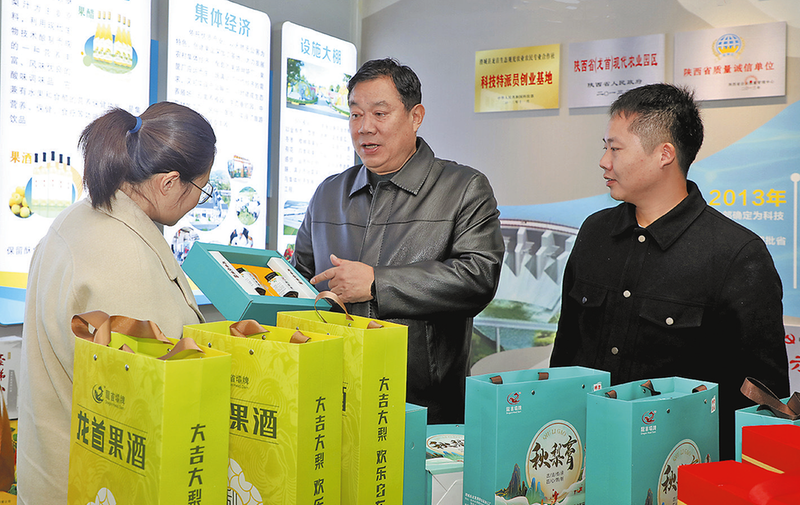樊建武(中)介绍村集体企业生产的农副产品。本报记者 马辛 摄