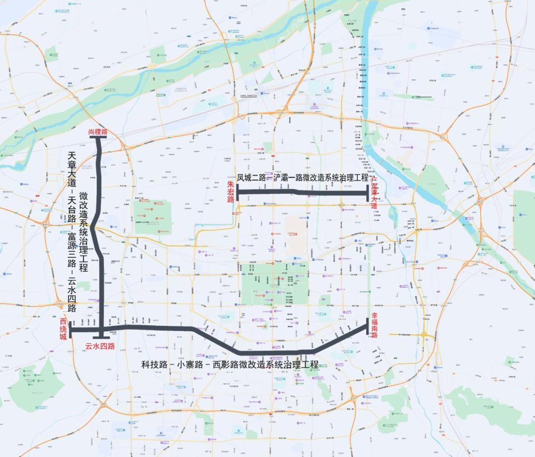 2、天章大道-天台路-富源三路-云水四路微改造系统治理工程,南起云水四路,北至尚稷路,全长约15.7km。涉及高新、雁塔、沣东新城、经开四个区域;主要内容包括道路工程、交通工程、照明工程、管线工程、绿化工程。