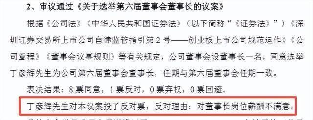 在选举第六届董事会董事长的议案中,公司同意选举丁彦辉为公司第六届董事会董事长,然而,对此,丁彦辉本人投了1票反对,反对理由是对“董事长岗位薪酬不满意。”