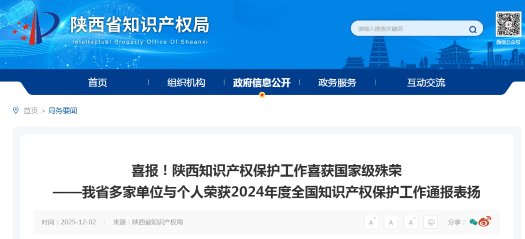近日,国家知识产权局、最高人民法院、最高人民检察院、公安部、司法部、市场监管总局联合印发《关于表扬2024年度全国知识产权保护工作成绩突出集体和个人的通报》,对在全国知识产权保护工作中表现突出的集体和个人予以通报表扬。其中,西安1个集体与3名个人受到表扬。