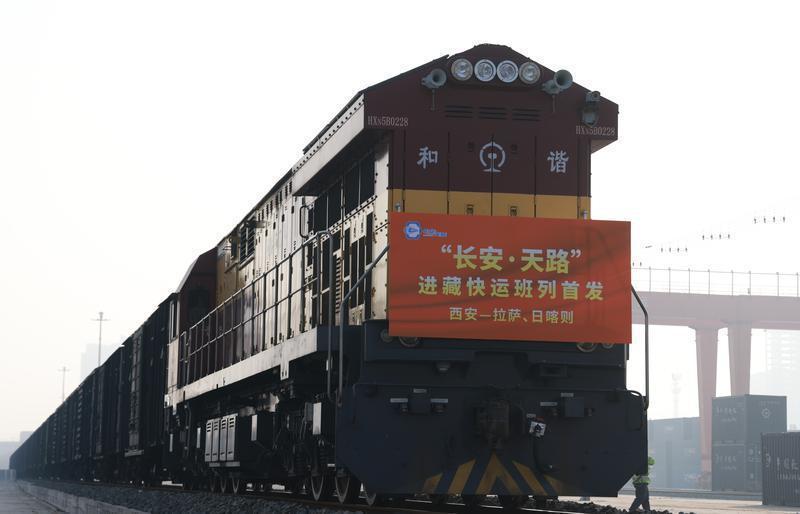 12月11日,满载30车食品、日用品、建筑材料等货物的X385次“长安·天路”进藏班列从西安国际港站鸣笛出发,一路向西开往西藏拉萨、日喀则。