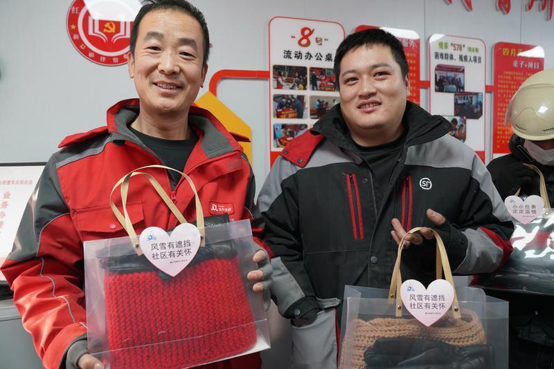 12月19日,在临潼区骊山街道东大街社区党群服务中心,20位外卖骑手和快递员每人收到了一份不同寻常的礼物——由社区志愿者亲手编织的围巾和保暖手套。