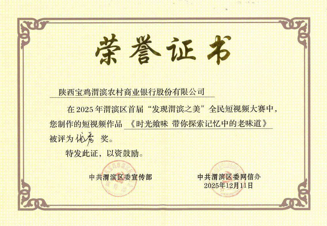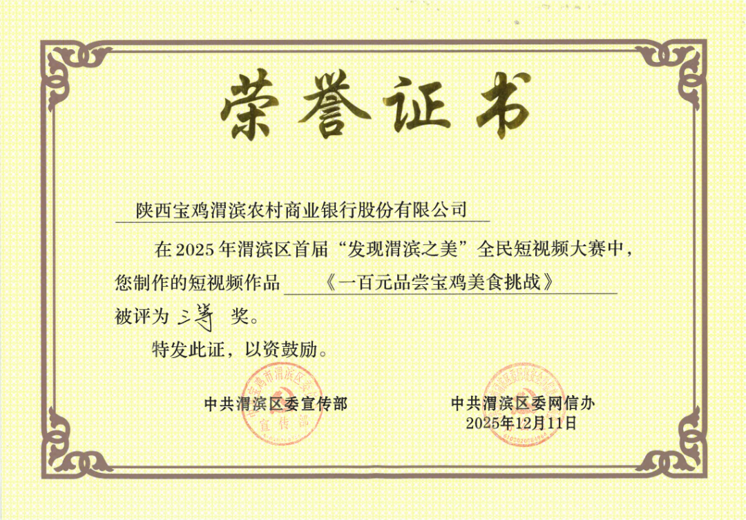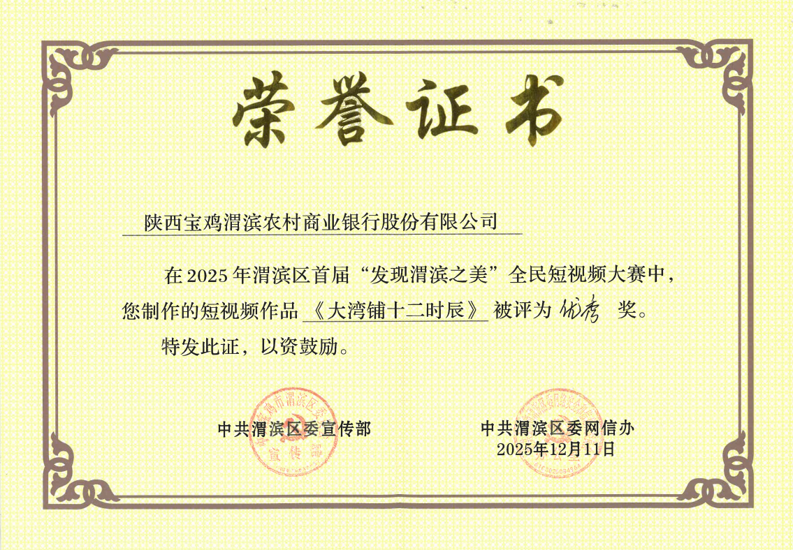 近日,在渭滨区委宣传部、区委网信办联合主办的首届“发现渭滨之美”全民短视频大赛中,渭滨农商银行看“渭”来融媒体工作室凭借四部兼具温度与深度的原创作品,从众多参赛作品中脱颖而出,荣获三等奖1项、优秀奖3项,成为本次大赛中获奖最多的金融机构参赛单位,充分彰显了渭滨农商银行在服务民生、赋能发展中的责任担当与创新活力!