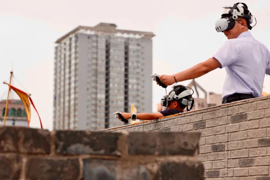 市民在城墙上体验MR混合现实项目。