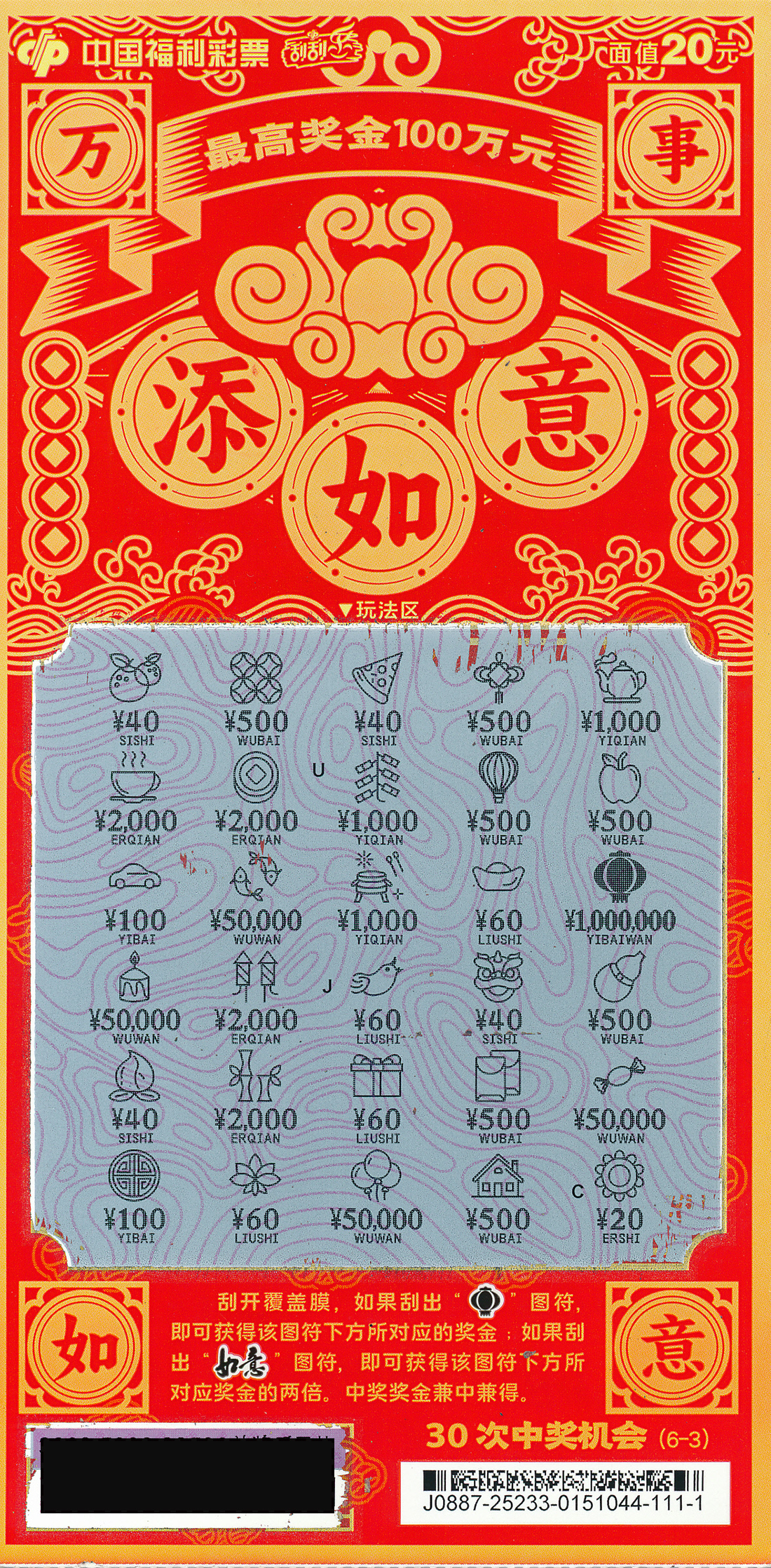 “这次就买了三张,我们一人一张。孩子和爱人先刮,我拿这个票总共就剩两张,我就随手取了一张。”随手抽取一张“万事如意”,竟刮中最高奖100万元,牛先生不敢相信,这一次大奖真的照进现实。