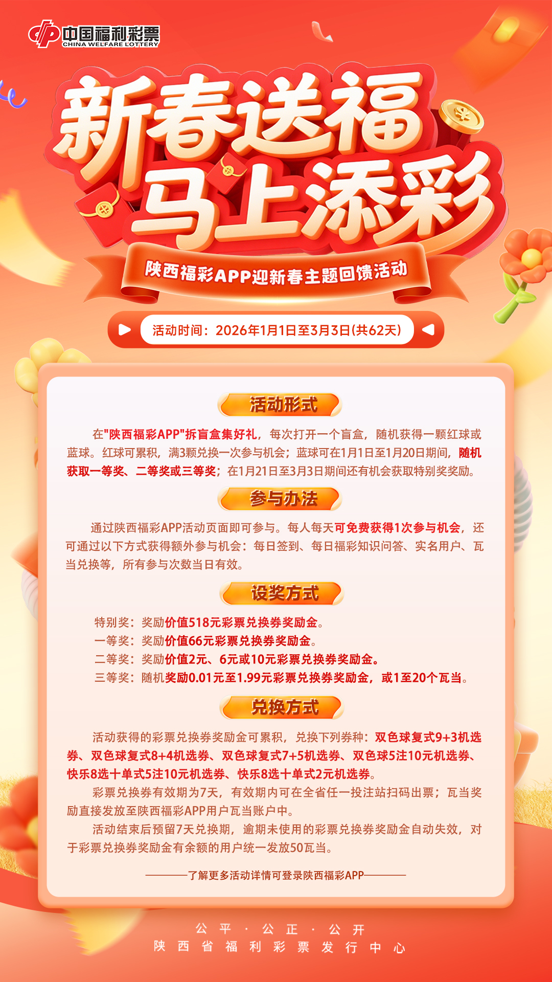 为庆祝新年,喜迎新春佳节,营造喜庆祥和的节日氛围,回馈广大购彩者长期以来对陕西福彩的支持与厚爱,陕西省福利彩票发行中心于2026年1月1日至3月3日期间,在陕西福彩APP平台推出“新春送福 马上添彩”主题回馈活动。本次活动通过趣味互动与多重奖励相结合的方式,陪伴用户共度新春,传递福彩温暖。