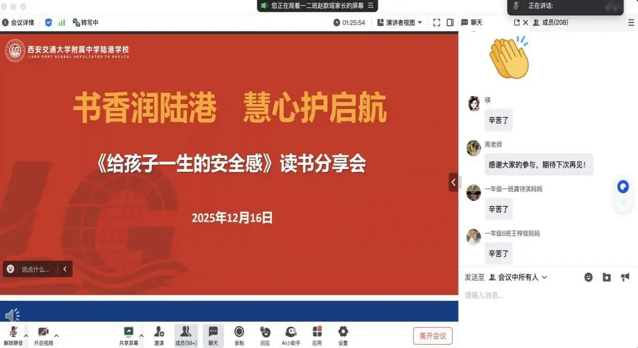 此外,学校还举办多场家校共育沙龙和家长读书分享会(线上),特别邀请兴庆校区老师带来专题讲座,聚焦孩子成长关键期的陪伴难题。家长读书分享会带动了更多的家长思考家庭教育和科学育儿。多元的家校互动,搭建起“学校引导、家长参与、双向奔赴”的共育平台,让教育合力更强劲,让学生的成长之路更顺畅。