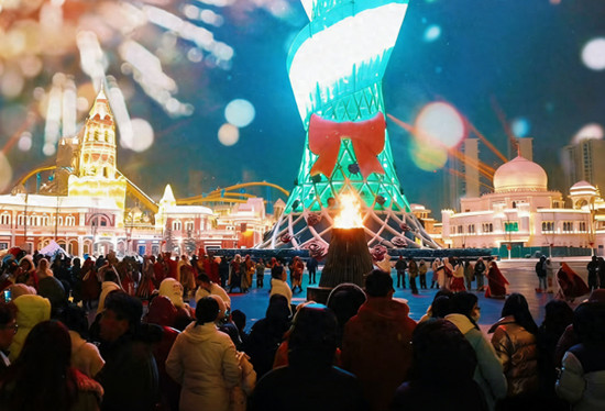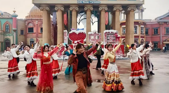 白天,冬日梦幻大巡游流光溢彩,丝路元素与童话氛围交融,亲子儿童剧温情上演,满是欢声笑语;夜晚,爱之塔光影流转,凤凰飞天、心愿树气球雨浪漫出圈,篝火派对、“跨乐2026”快闪秀燃动全场,丝路福礼派送与文化互动持续升温。
