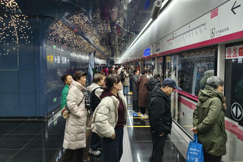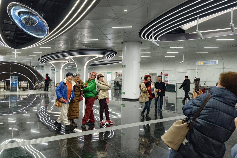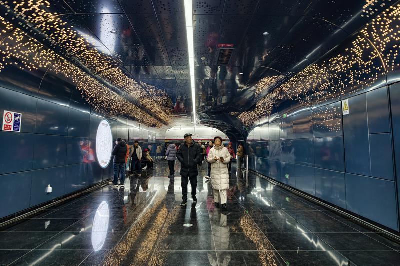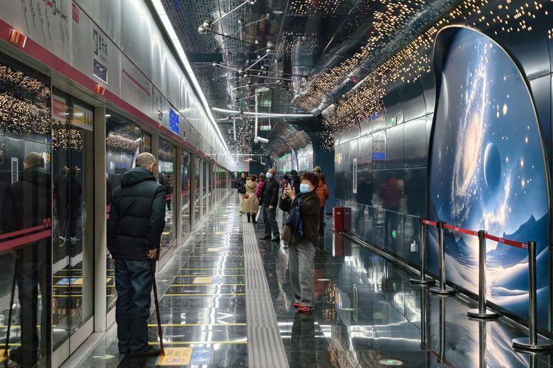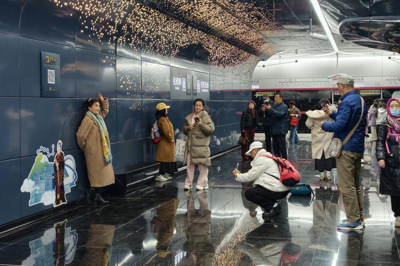 近日,西安地铁15号线皇子坡站成为热门打卡点,独特的设计风格吸引众多市民前来体验、拍照。站内深蓝色穹顶缀满“星辰”,搭配航天壁画打造出如梦似幻的乘车环境。图为1月12日,市民在皇子坡站内拍照留念。