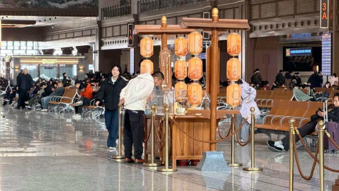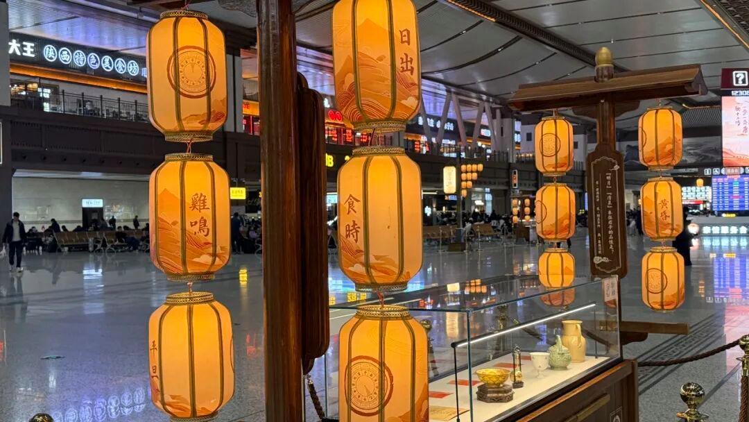 西安站候车厅走廊上,精心布置有两组主题文化灯笼。在相邻灯笼间设置有唐诗问答,复刻了古人从右至左的阅读方式,于细微处彰显文化自信。带孩子出行的旅客纷纷感慨,候车时间变成了生动的文化课堂。