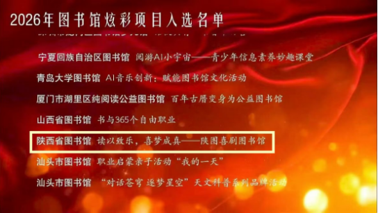 近日,在由国家图书馆出版社主办的“图书馆人奇妙夜”年度盛典上,陕西省图书馆高新馆区推出的“读以致乐,喜梦成真——陕图喜剧图书馆”项目,凭借其创新理念与显著实践成果,成功入选2026年图书馆“炫彩项目”。这也是该馆继2025年“理想开花”儿童创新教育系列活动获奖后,再度获此殊荣。