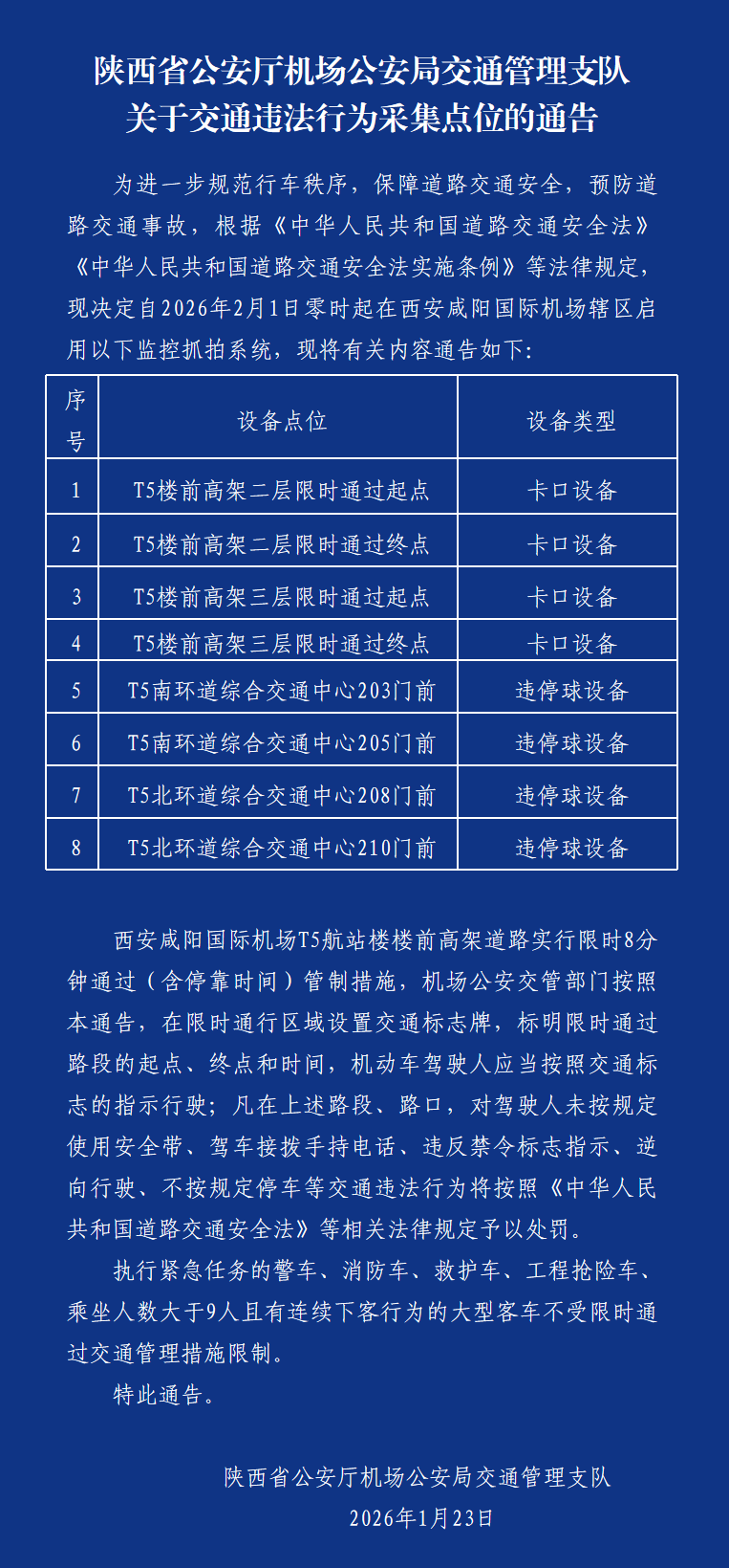 1月23日,陕西省公安厅机场公安局交通管理支队发布通告,为进一步规范行车秩序,保障道路交通安全,预防道路交通事故,根据相关法律规定,决定自2026年2月1日零时起在西安咸阳国际机场辖区T5航站楼周边启用8处监控抓拍系统。