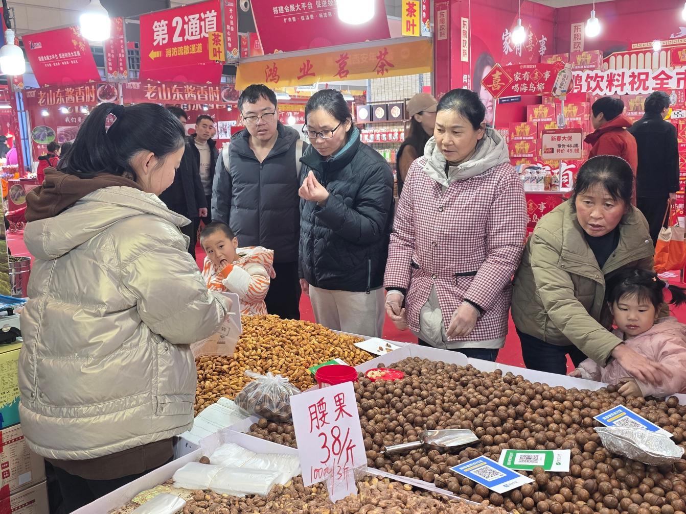 步入1.6万平方米的展馆,满目皆是喜庆的中国红,洋溢着吉祥热烈的节日氛围。尽管已是开幕第五日,上午十时许,馆内依旧人潮涌动,提着手拉车、拎着大号购物袋的市民们在各个展位前流连忘返,询价声、欢笑声、孩童的欢闹声此起彼伏。