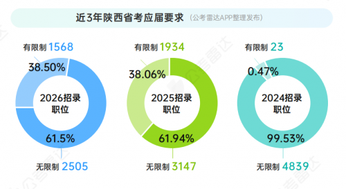 2026陕西省考在为往届生(无应届限制岗位占61.5%)保留充足的择岗空间的同时,继续向应届毕业生倾斜,限应届占比微增至38.5%,较 2025 年小幅提升0.44个百分点,为高校毕业生提供了重要就业通道。