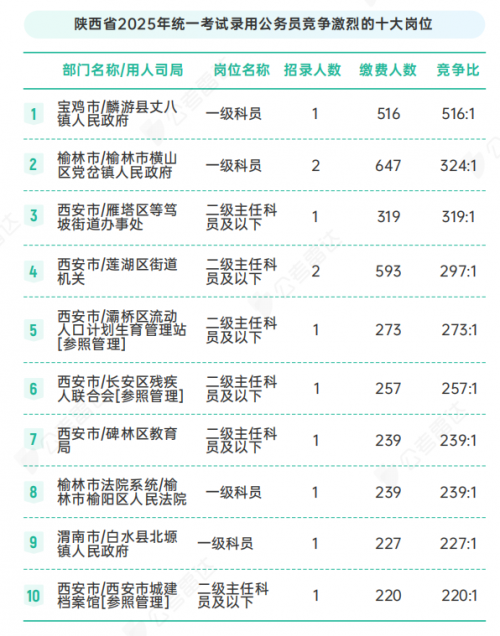 面对缩招背景下的激烈竞争,“选岗博弈”成为考生上岸的关键。参考2025年陕西省考报考数据,最热门的岗位竞争比达 516:1,不少考生即便笔试分数远超部分基层岗位进面分数线,也因盲目扎堆“过独木桥”遗憾落榜。在公务员考试中,科学选岗与高效备考同等重要!