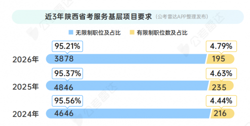 面向服务基层项目(如“大学生村官”、“三支一扶”人员等)人员的岗位占比在近三年呈现出缓慢上升的趋势,2026年占比升至4.79%。