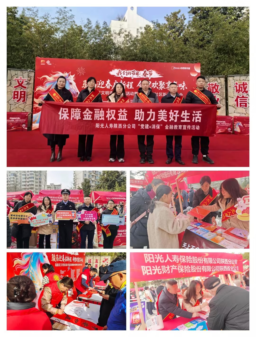 2月10日,为营造欢乐祥和的节日氛围,提升居民金融安全意识,西安高新区枫林绿洲社区在兰岛广场举办“我们的节日:春节”社区庙会志愿服务集市暨金融教育宣传活动,公安高新分局民警深入社区进行反诈防骗宣传,阳光人寿陕西分公司积极响应,在送去新春祝福的同时开展“党建+消保”金融消费者权益保护宣传,助力居民平安过节。