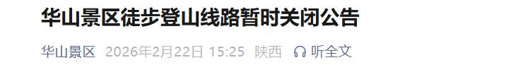 2月22日,华山景区发布公告,由于天气原因,自今日(2月22日)18时起暂时关闭华山门徒步登山线路,已预约购票的游客可在原购票渠道申请退票。