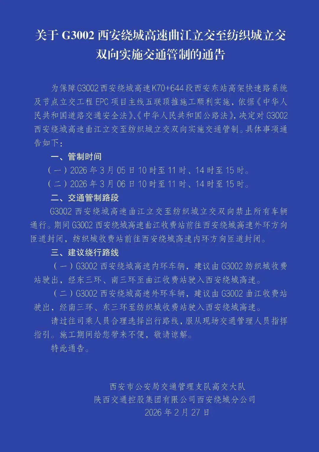 G3002西安绕城高速曲江立交至纺织城立交双向禁止所有车辆通行。其间G3002西安绕城高速曲江收费站前往西安绕城高速外环方向匝道封闭,纺织城收费站前往西安绕城高速内环方向匝道封闭。