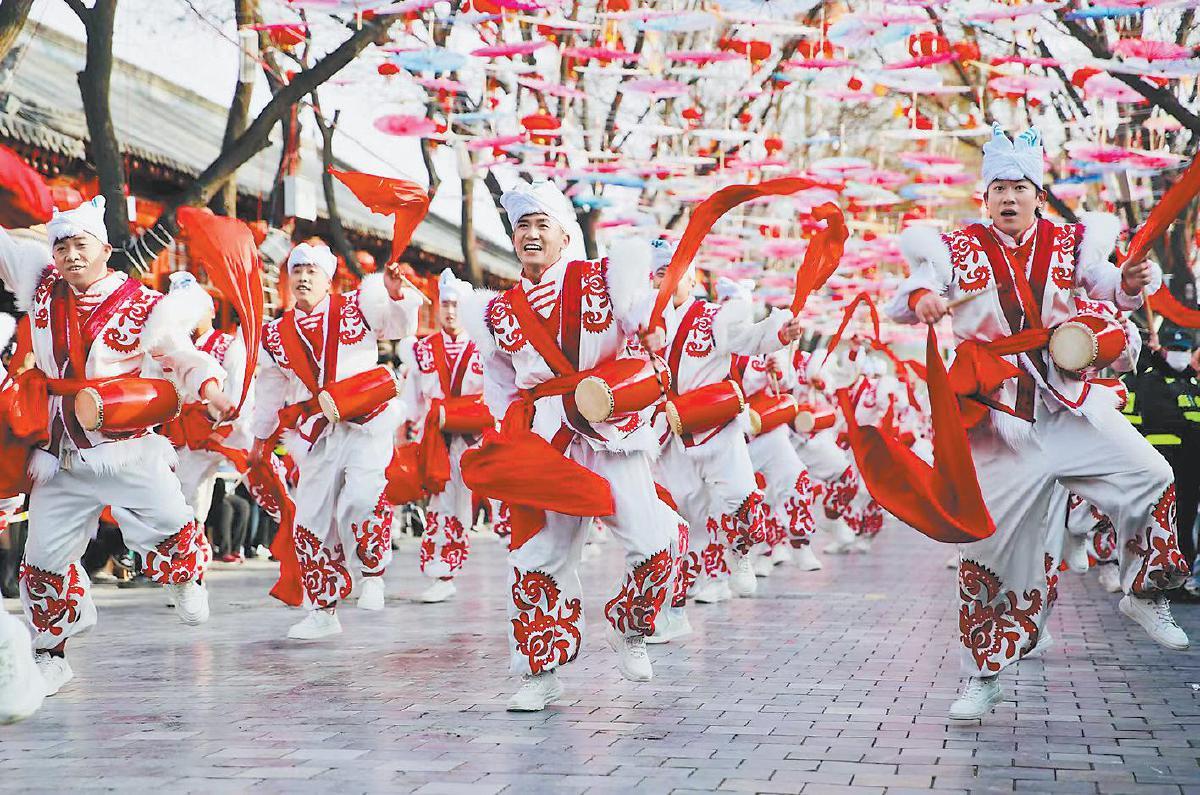 3月2日的秧歌展演中,刚劲有力的横山老腰鼓舞出了榆林人的豪迈自信,而浙江长兴百叶龙尽显江南灵秀。记者 杨彬 摄