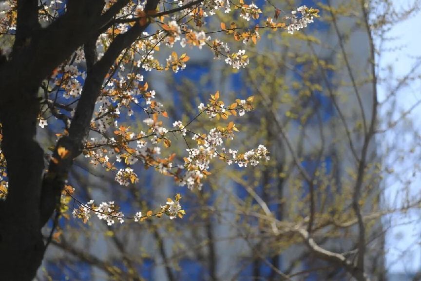新纪元公园:迎春、连翘、玉兰、红叶李、红梅、樱花、丁香;