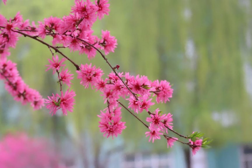 菊花碧桃:蔷薇科桃属落叶乔木,株型紧凑,花瓣纤细繁复,因花开似菊花而得名,花期3-4月。