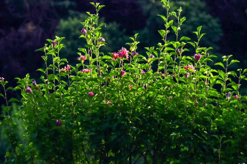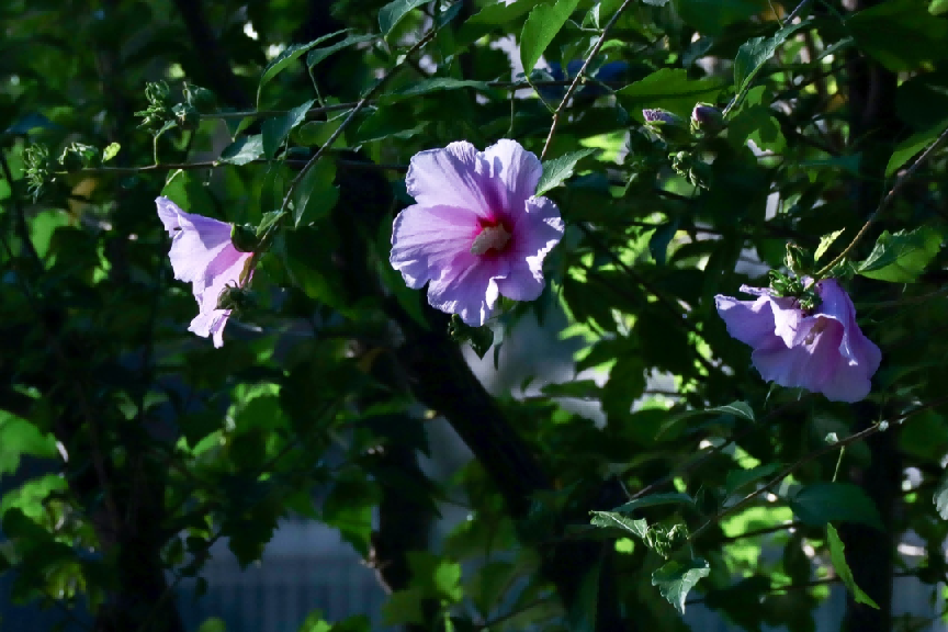木槿:槿花不见夕,一日一回新。又名白槿花、榈树花、白饭花、舜华等。木槿花花期较长,大约从每年的7月份一直开到10月份。