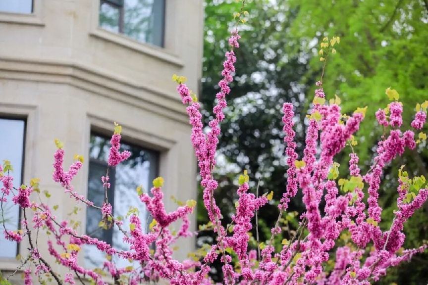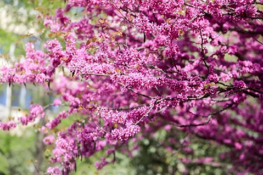 紫荆:豆科紫荆属落叶乔木或灌木,先花后叶,花期在3-4月。