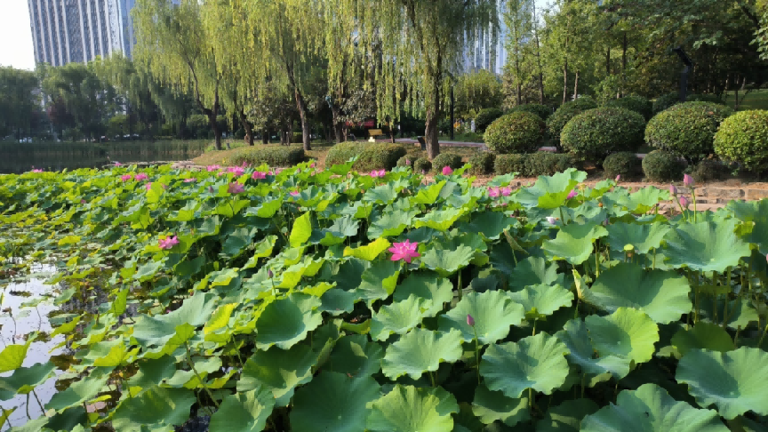 荷花:又称芙蕖、菡萏、水芙蓉,莲科莲属植物,多年生水生草本花卉,花期6-7月,是湿地生态修复的重要物种。
